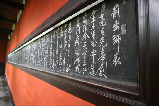 進入第二道門是劉備殿,兩側走廊刻有岳飛手書的諸葛亮”出師表”。但也有一種說法,其實是明代的白麟所偽書。據說毛澤東當年來到此地後,看到此書法大為讚嘆,回去後開始不斷臨摹,所以與其親筆書法極為相似。