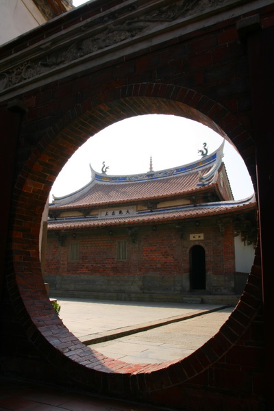 中間殿門之間八掛造型的夔龍窗,採雙面透雕的工法,為龍山寺內木雕美術工藝的精華。仔細近觀這夔龍窗,可以發現其中大有玄機在!中央是兩尾鯉魚,象徵太極生兩儀;外圈為四條龍,代表兩儀生四象;四象生八卦;四個角為四隻蝙蝠,意思為”賜福”。