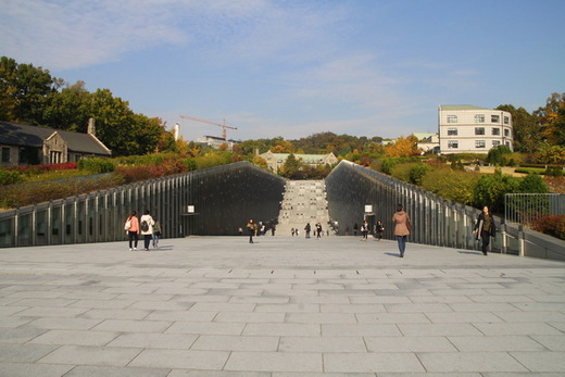 進入梨花女子大學的校區入口圓環的右側是一棟由法國建築師Dominique Perrault設計的建築物,”梨花女子大學校園中心”(Ewha Womans University Campus Center)」。因為這棟造型特別的建築物(正確的說其實應該是兩棟),依山坡地谷而設計,中央為廣場、步道及階梯,兩側的玻璃帷幕牆是兩棟大樓,包含有教室、圖書館、劇院、商店等,兩棟大樓上方覆有綠地,如同兩座山包圍著山谷般,所以學校的師生也稱這座建築為「大峽谷」。
