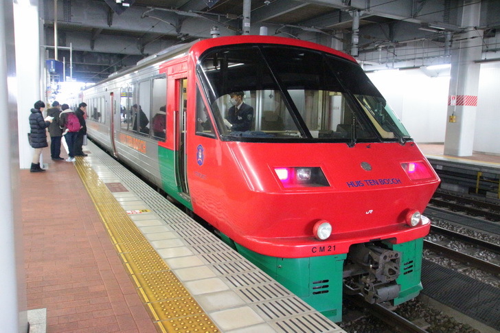 這みどり(綠色)特急列車,採用的是九州特產的草莓色系,也有人說是聖誕色系。開往的終點站有兩個,佐世保和豪斯登堡。不用懷疑!終點站確實是有兩個。這從長崎本線接佐世保線的列車,在抵達早歧後,會進行"分裂式"。一半前往佐世保,另一半開往豪斯登堡(ハウステンボス/Huis Ten Bosch)。
