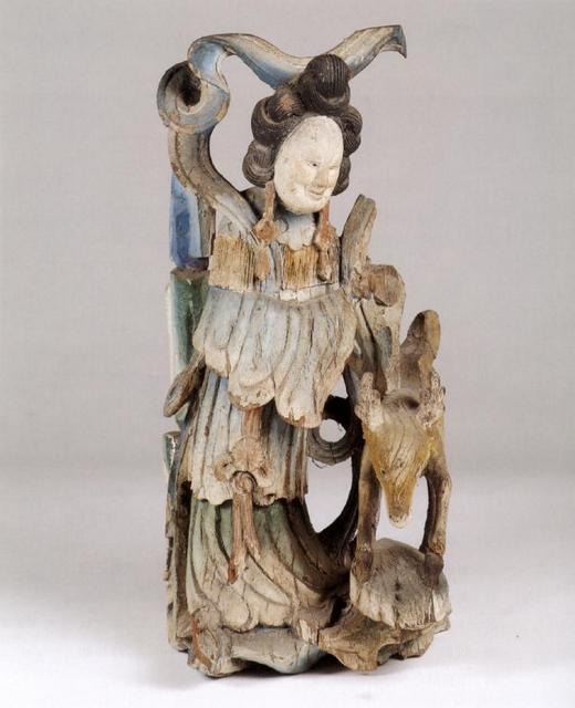 麻姑為長壽仙女之說,最早見於晉朝葛洪《神仙傳》,謂其為東漢仙人王方平之妹,年約十八、九,手似鳥爪,頭梳髮髻,餘髮散垂及腰,其衣有文采,又非錦綺,卻光彩奪目,有仙術。麻姑與兄長再度相遇時,稱已五百年未見面,東海已三次桑田,由此可見其長壽。《續文獻通考》載:「麻姑,王方平妹,桓帝時,修道於牟州東南餘姑山。」