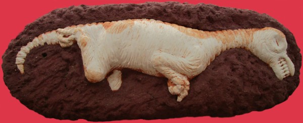 The four feet of this baby dinosaur were running for surviving from perils. It should have been suddenly covered by the volcanic ash at so high as 300 degrees centigrade thermometer from the volcanic eruption and its skin was carbonized as the 20 victim-citizen-bodies in Pompeii Italy during the great Mount Vesuvius volcanic eruption. It was further calcified after several ten or hundred millions years and became a white calcified body.