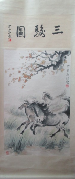 Ink and color on paper, mounted on one hanging scroll, signed BEIHONG, inscribed AUTUMN 1943, with two seals of the artist, inscribed by LI KERAN, signed KERAN, titled THREE HORSES, with one seal of the inscriber.