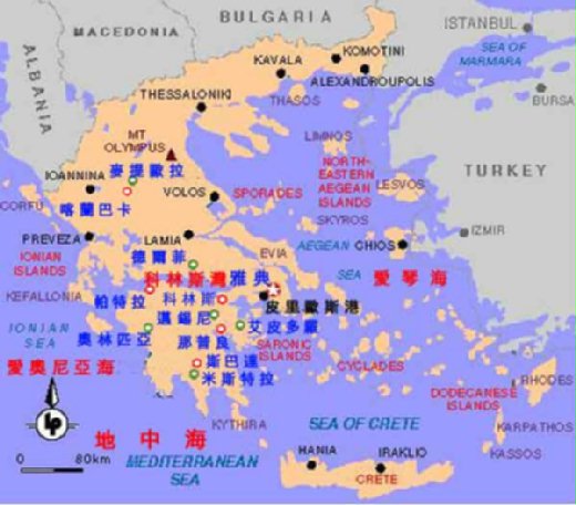 在Google抓了一張英語希臘地圖,本次行程相關位置名稱重新換上中譯名,紅底白心是主要城市,綠底白心是本次行程古文明遺址所在,敬請參考!!