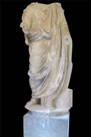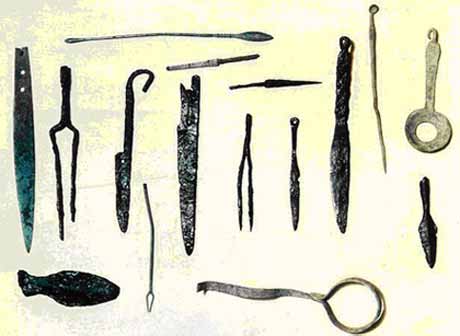 館內所陳列的出土文物雖然不多,還是有點看頭,一些斷頭男女雕像的衣褶十分美麗,特別選出一張,將背景修飾反黑,請大家指教;正門入口玻璃櫥窗內陳列著一套古代醫用器材,因為現場照相有反光,特別引用資料照片。