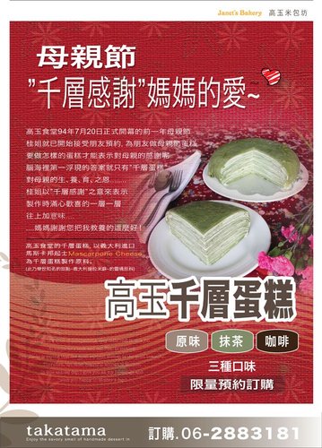 台南高玉食堂94年7月20日正式開幕的前一年母親節,桂姐就已開始接受朋友預約,為朋友做母親節蛋糕,要做怎樣的蛋糕才能表示對母親的感謝呢?腦海裡第一浮現的答案是”千層蛋糕”想不出別種。