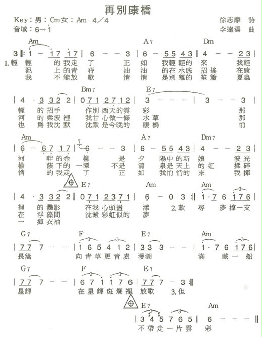 輕輕的我走了,正如我輕輕的來;我輕輕的招手,作別西天的雲彩。那河畔的金柳,是夕陽中的新娘;波光裏的豔影,在我的心頭蕩漾。軟泥上的青荇,油油的在水底招搖;在康河的柔波里,我甘心做一條水草。那榆蔭下的一潭,不是清泉,是天上虹;揉碎在浮藻間,沉澱著彩虹似的夢。尋夢撐一支長篙,向青草更青處漫溯;滿載一船星輝,在星輝斑斕裏放歌。但我不能放歌,悄悄是別離的笙簫;夏蟲也為我沈默,沈默是今晚的康橋!悄悄的我走了,正如我悄悄的來;我揮一揮衣袖,不帶走一片雲彩。