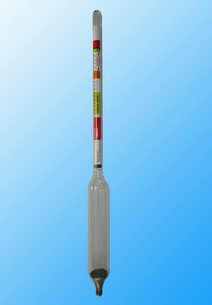 A hydrometer is usually made of glass, and consists of a cylindrical stem and a bulb weighted with mercury or lead shot to make it float upright.