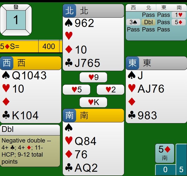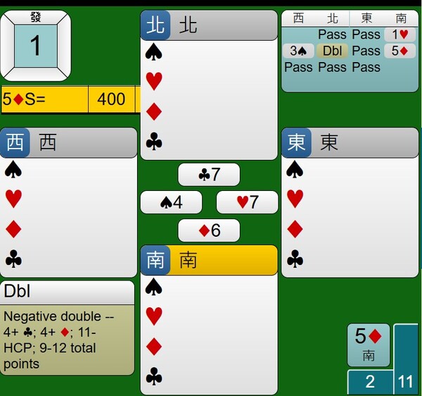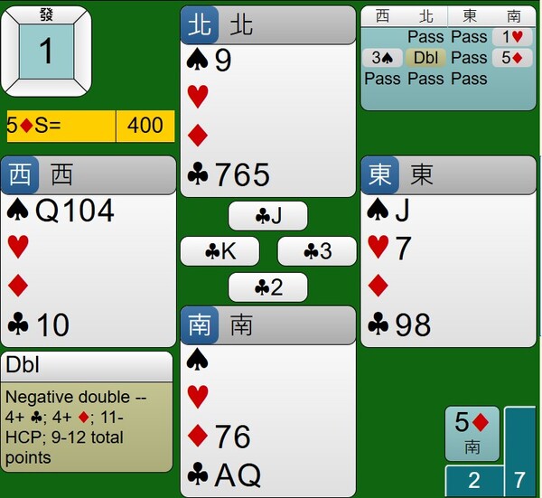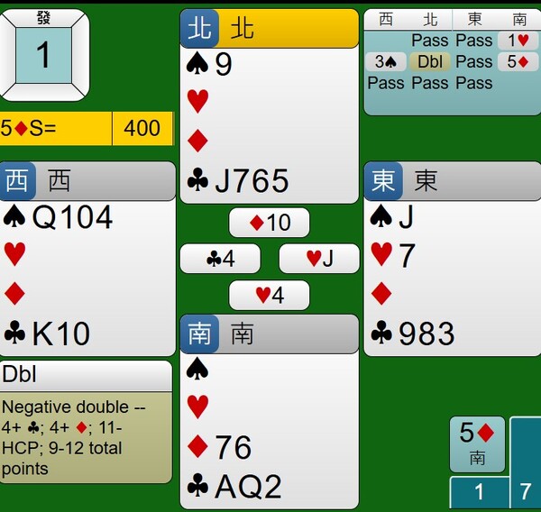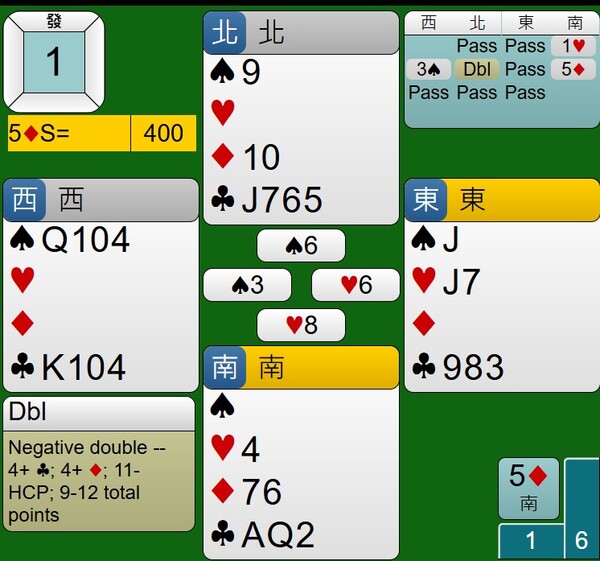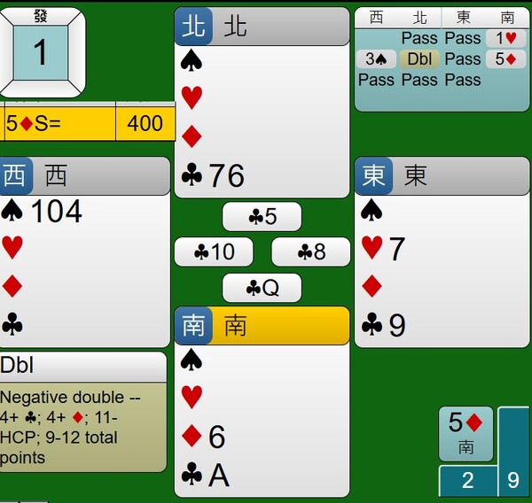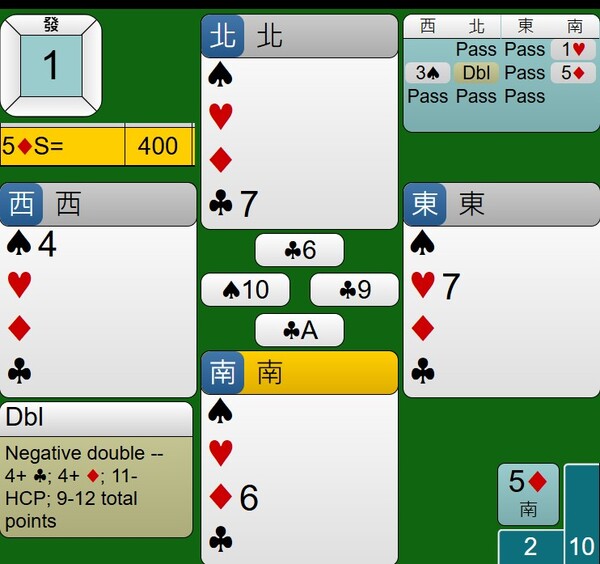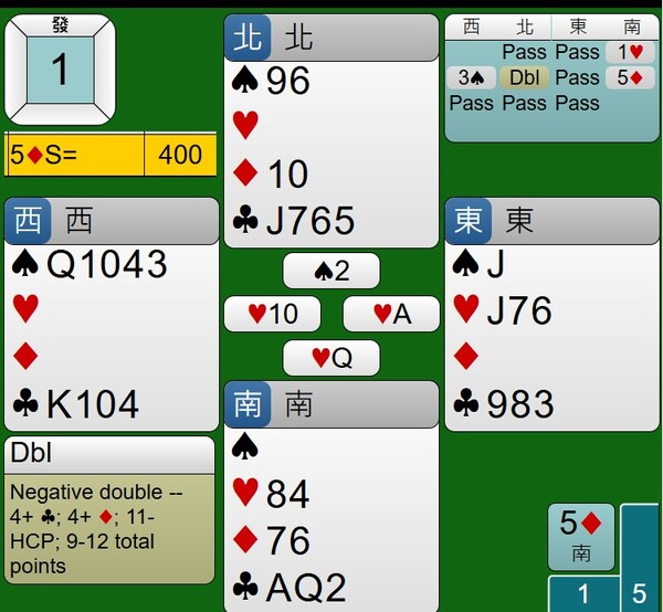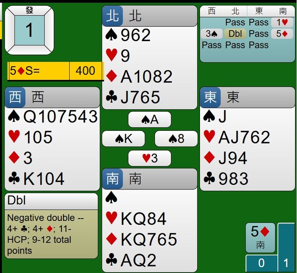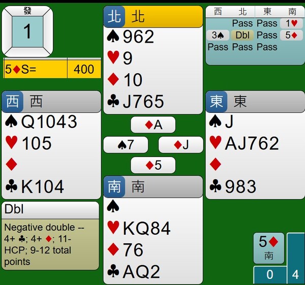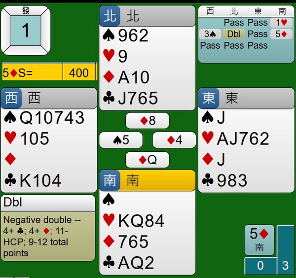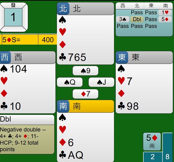 最後莊家連拔梅花AQ、王牌方塊6,5D合約如期完成,得到400分。
