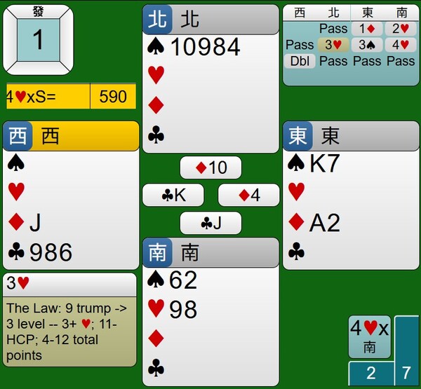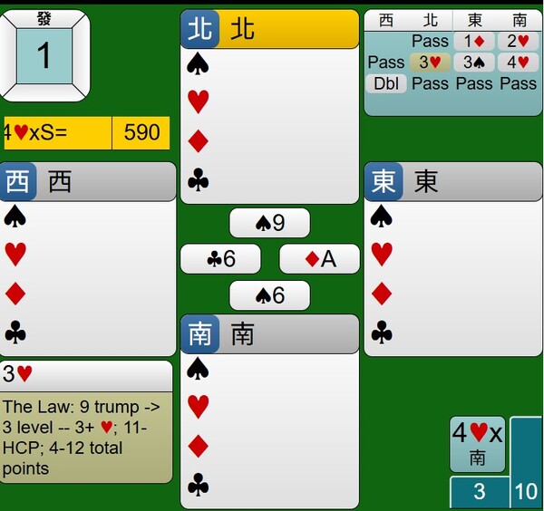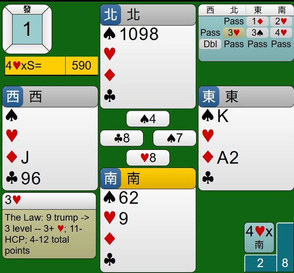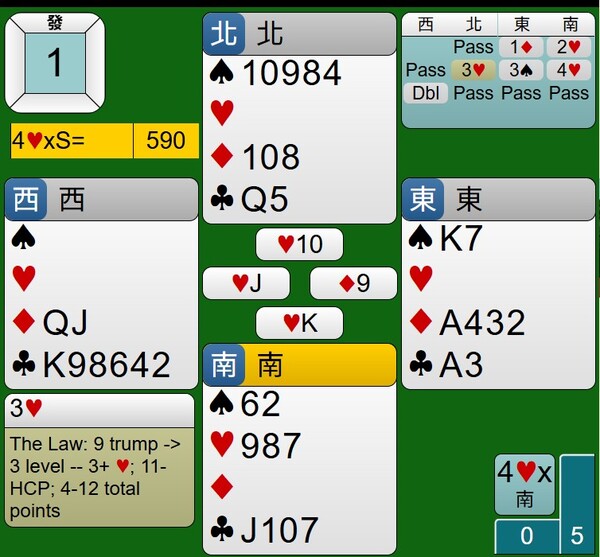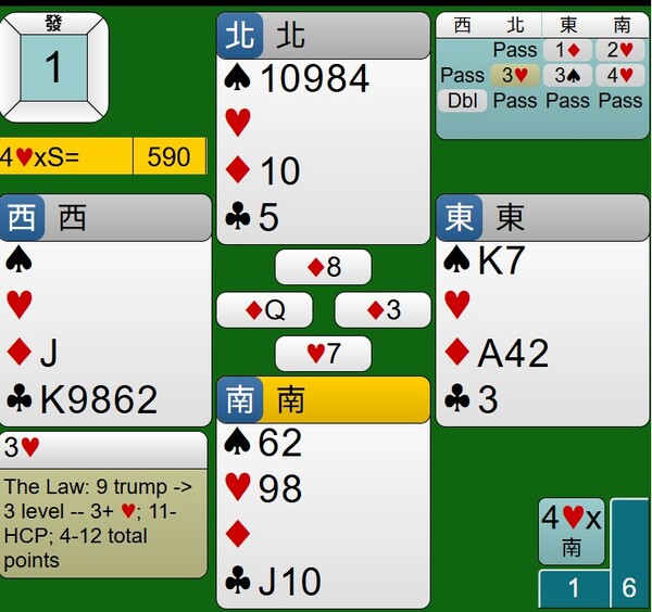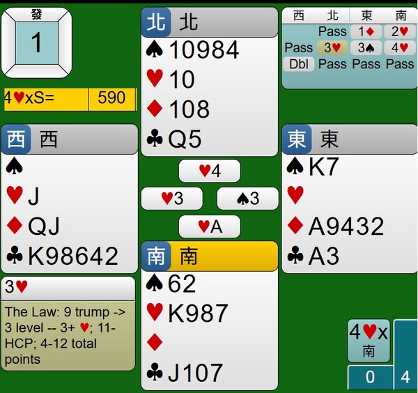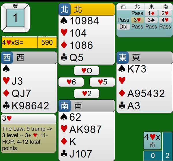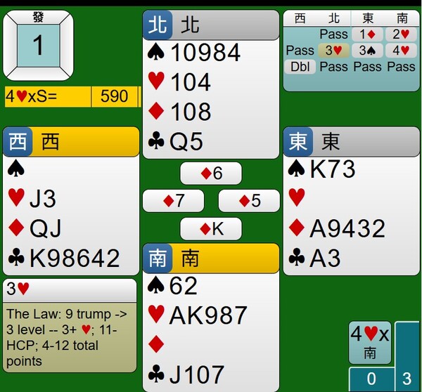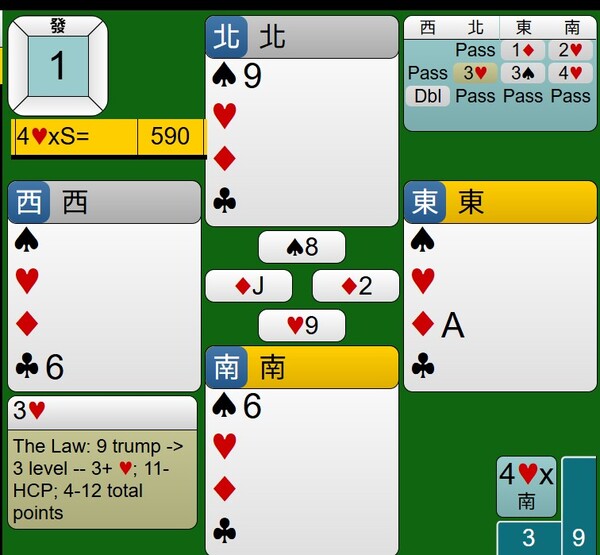至於西家的DBL是否多此一舉,其紅心持有JXX,應該有阻嚇作用,只是時機不對,對家攻防也沒有到位,讓東西家得分由-100分,進階到+590分。