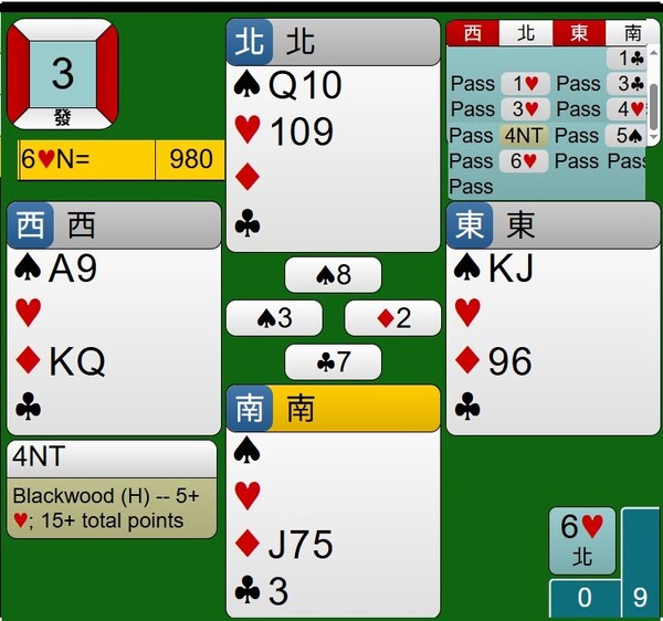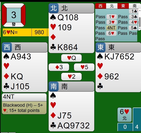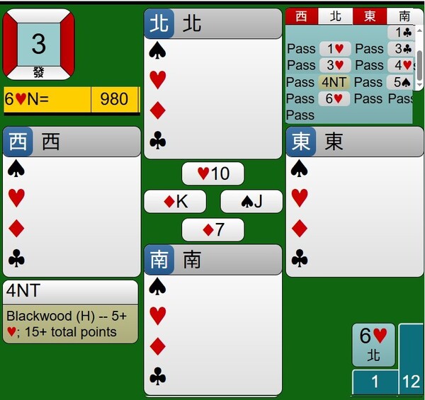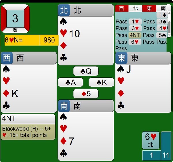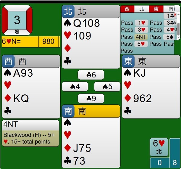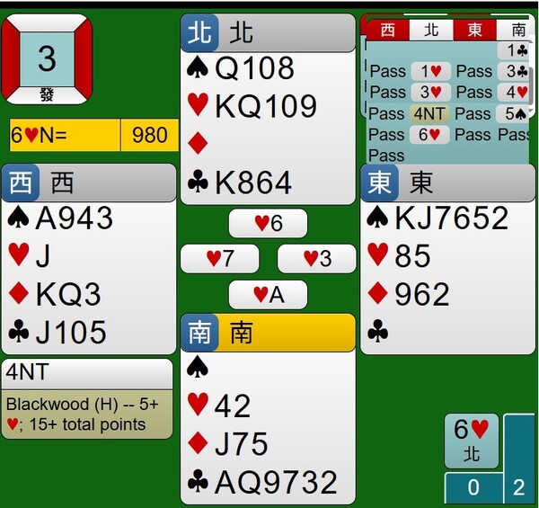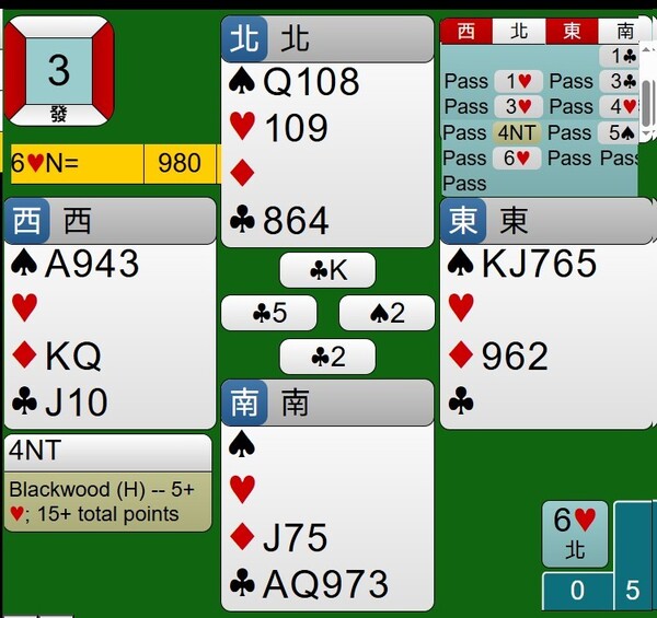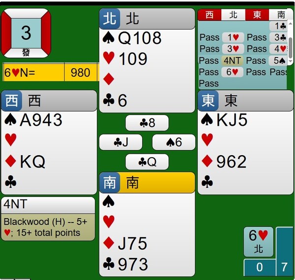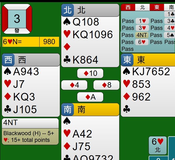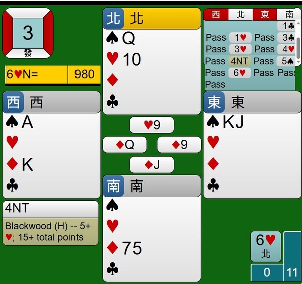 所幸東西家的王牌紅心是3-2分配,能夠如期完成清理王牌工作,接著莊家連拔6張梅花,最後黑桃落入西家黑桃A,達成小滿貫牌局,得到980分。