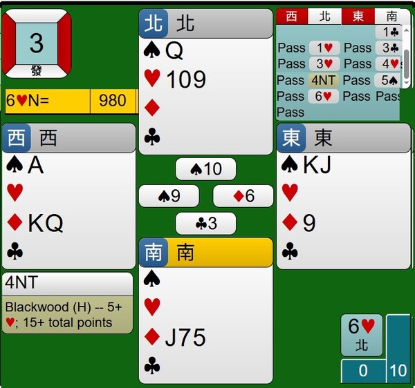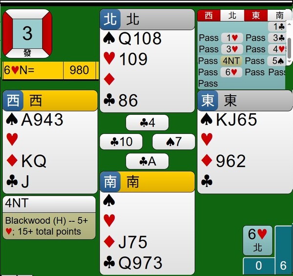 南家以1C開叫,北家以1H回應,南家以3C表示有6張以上梅花,北家以3H表示紅心堅強5張牌組,南家以4H表示有3張紅心AXX,南北家合計26點,紅心牌組合計8張,4線紅心合約尚可,北家以4NT進行黑木詢問ACE張數,北家手上沒有ACE,以Black Wood詢問ACE,顯然有積極得追求大小滿貫的慾望,南家以5S表示有3張ACE,北家以6H束叫。