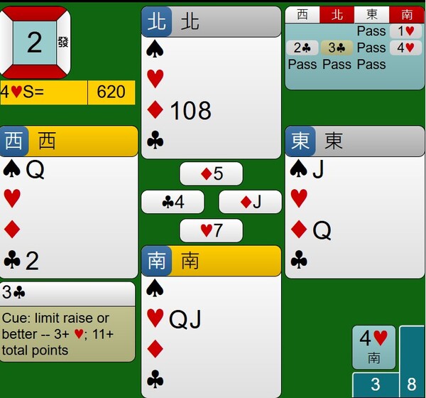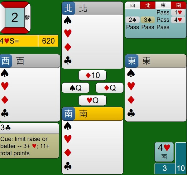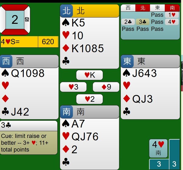 東家PASS之後,南家手持15點6張紅心AQJXXX,以1H開叫,西家首持10點6張梅花AKJXXX,以2C蓋叫,北家手持11點3張紅心KXX,以3C回應,南家以4H束叫。