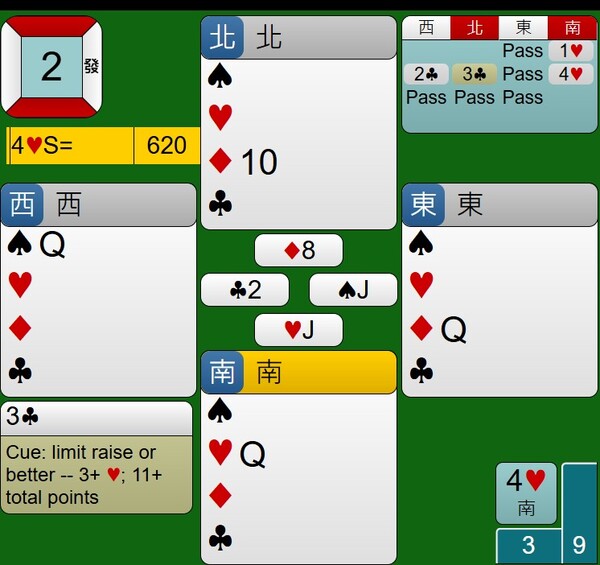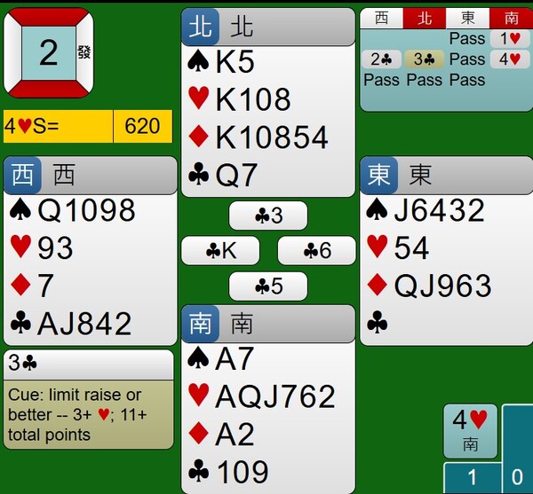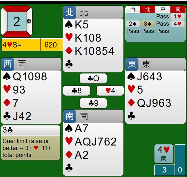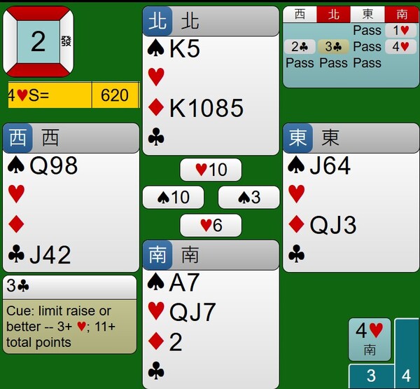 南家以1H開叫,西家以2C蓋叫,北家以3C回應,這個CUE特約叫法要求成局,南家以4H束叫。