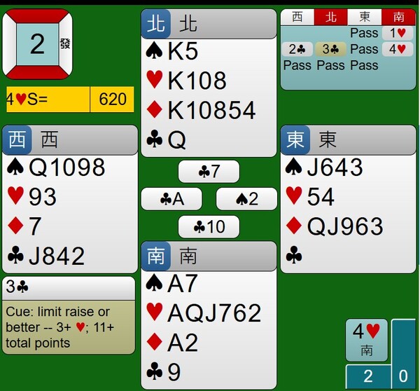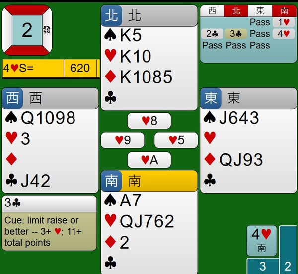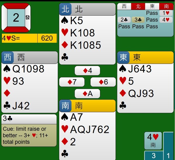 夢家再拔王牌紅心一輪,莊家忘記東家竄吃梅花,已經用掉一張王牌。