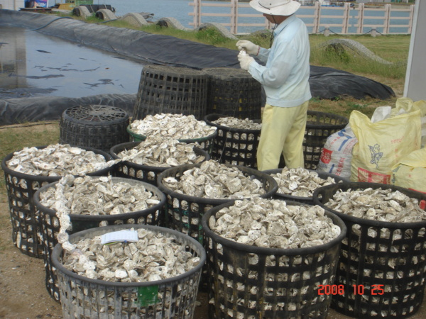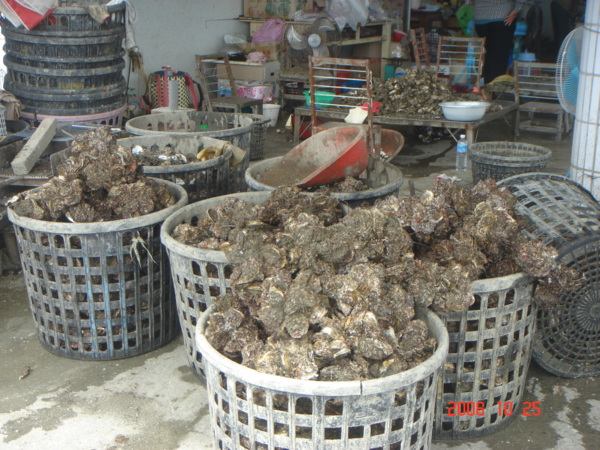 整簍的牡蠣,由海裡剛撈起,現採現挖,保證新鮮。