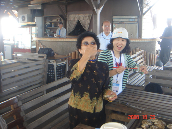 南投縣家長關懷教育協會理事長王淑專會長,正在品嚐烤牡蠣的滋味。