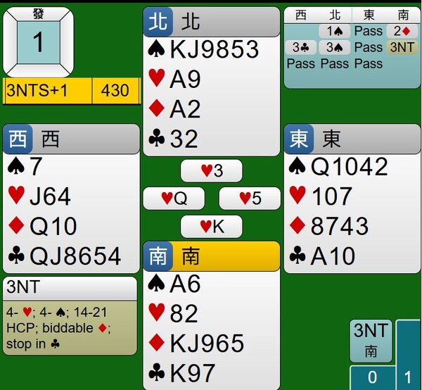 北家手持12點6張黑桃KJXXXX,以1S開叫,南家手持11點5張方塊KJXXX,以2D回應,西家首持8點6張梅花QJXXXX,以3C蓋叫,北家以3S回應,南家以3NT束叫。 西家首攻紅心Q,莊家以紅...