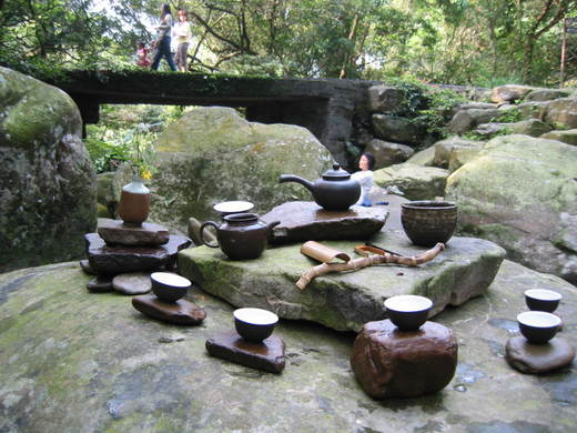 四月十二日由曾至賢老師帶領信義社大茶藝班學員來遠望坑古道採茶兼品茗,09:30一行人相約在草嶺古道拱形橋旁之停車場集合後.沿古道前行至古道北口轉過遠望坑橋至遠望坑街11號石屋民宅.稍事休憩後,就朝著遠'望坑古道石階登上, 不用10分鐘即已抵茶園,大家分頭採集,至一定數量,利用陽光來萎凋.後置陰涼處自然萎凋.在萎凋之等候期間,在山道中擺設茶席煮水泡茶,第一壺開胃茶----正山小種紅茶打先鋒.接著第二泡茶為梨山輕焙火之烏龍茶.第三道茶搬出武夷百歲香.大夥連品三種名茶,在品茗論香中,氣香,茶香,杯底香全面入流於味蕾,鼻腔,口 齒間使感官飛舞帶茶韻.甘.香.清.甜,色香俱全.喝完通體舒暢.結束山道茶宴,回至草嶺古道北口大榕樹之溪邊,再次擺設茶席.曾老師提供[大紅袍]做今日品茗總結,這大紅袍果然夠勁,一入喉兩腮如火山猛爆迴環,岩韻持久香氣迴盪,不愧為茶中極品.此茶讓新加入此行列之山友,有著全新之體會,喝茶不只是喝茶而已.也引領其進入品茗新境界.