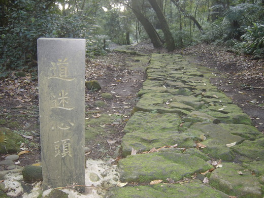 搭乘小九公車至花鐘處下車,順著步道石階先往辛亥光復樓行去,一棵老梅樹花開滿枝頭,美美美.一棵抵百,賞梅不用到風櫃斗,陽明山就有.賞楓不用去奧萬大,公園內多啦.陽明山國家公園,大眾交通方便,距離城市不遠,真是大台北地區居民之後花園,一路慢行賞景賞花行至杜鵑花園,再沿人車分道往苗圃方向在七星山登山口涼亭稍事休息喝老茶後,仍沿步道走到陽明書屋叉路,左轉至中興路6-1號路口右轉而下,這裡就是通往[蟬鳴迴廊]秘境之出入口,產道陡下再通過民宅門前而前行.再遇民宅右轉五公尺,就遇[回首]大理石碑佇立路徑旁.接著一連串的[忘路],[空碑],[觀谿][空步],[枯涉],[緣溪行]石碑,若看到[緣溪行]之石碑,右轉即是前往湖田國小之步道,左轉而行過空留橋,[蟬鳴迴廊]碑即現.再走十餘公尺,有一遺留之崗哨亭,路徑成為Y字型,叉路口立一石碑[道迷心頭]另一側為[同歸心道],這裡右行轉往猴崁水圳道,左行過孟宗竹林至玉瓏谷餐廳.秘境之步道很短,至此就結束,然山不在高,水不在深,而步道不在長,幽靜則靈.