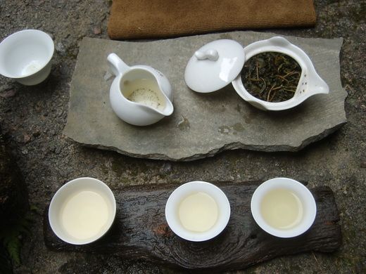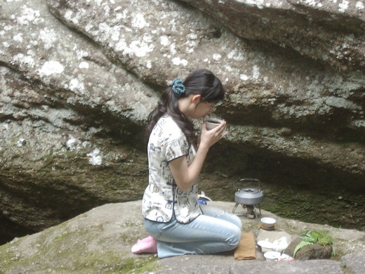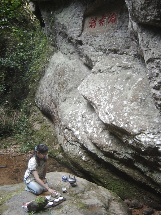 此次走訪武夷山的三坑[慧苑坑,牛欄坑,倒水坑]兩澗則是[流香澗與悟源澗],在走至流香澗時也學古人品茗於幽靜還境中,享受品茶之樂趣.首泡以由台灣帶去之[佛手]再用個人坪林之40年包種老茶作結.在大自然環境裡品茗是別有一番滋味在心頭.