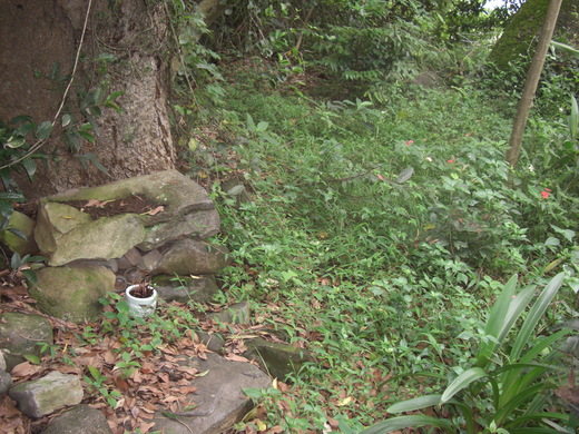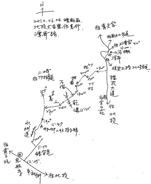 梅雨已連下一星期,趁今早陽光露臉,陽明山區大屯里有眾多古道.到北投任意行.捷運北投站轉乘小6公車,於上清宮站下車.行面天步道往北投方向經歷仙亭,忽見一廢棄之石棚,因位於雜草叢內不明顯,此石棚究係土地公?有應公或地基主?待查.前行過了復興三路210號之豪宅,穿越馬路下行,轉彎處即櫻花大道,右轉入一條小徑,裡頭為綠竹林,剛翻過土,種植面積相當寬闊,今日只是想隨意走走,未帶地圖,只因在小6公車上突然看到此條小徑,臨時起意想探究,幸好指北針有隨身帶.單憑個人對此區之印象來抓方位.過綠竹林轉西南向之柑橘園後,墾殖地至此打住,看前方有溪溝轉南有石階順溪溝旁平行而下,循石階而下過溪溝再遇綠竹林.仍朝西南方向撥草前行,越過綠竹林古墓忽現,是一亂石砌製之墓碑,旁有似后土之石塊,上有一小石頭,似有掃墓之跡象,古墓年代應已久遠.這種亂石古墓曾經在竹子山古道與坪林大舌湖一帶見過,這裡是第三個亂石砌古墓.記錄完畢轉西向270度方向5分鐘接到竹林步道,右往[北向]二崎之挑炭古道,轉南向下錫安巷回北投中和街,因天色不佳,匆匆下山返回.不管走多走少,有走就好,今日收穫不少.