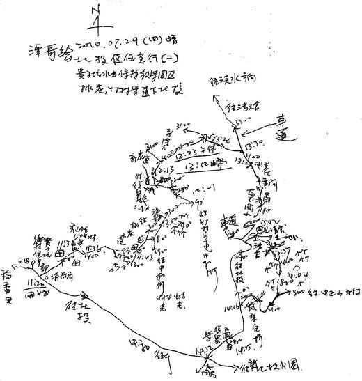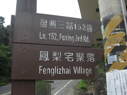 捷運北投站轉乘218公車至貴子坑水土保持園區站下車,11:20熱身後沿消防隊秀山分隊前之磨坑溪旁道路北行.到貴子坑鄉村俱樂部前行,於花光寺右轉進入竹林.十分鐘後遇一磚造房舍[水磨52號]循屋後步道直行,遇叉路轉行東北方向往竹林步道,上到二崎復興三路0.7K路標處,此區為二崎生態園區,主人已將此處整理可供休憩.天氣悶熱,在此午休.13:15再度出發.13:27出柵欄抵馬路左邊有一早期燒炭窯.此地轉向南行往吳氏宗祠再過大屯國小沿面天步道轉向至上清宮方向.過福德宮轉東南行至鳳梨宅.14:15抵復興三路鳳梨宅公車站牌.由此向南行順車道過中和街進大同街15:00回北投捷運站.全程約3小時.