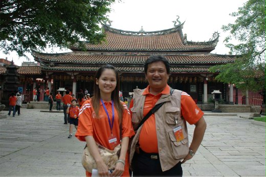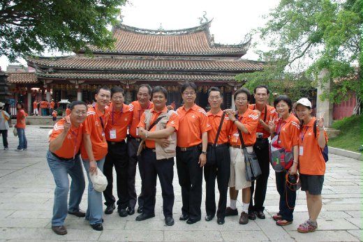 最叫人尷尬的是在泉州天后宮參觀時,年輕的小夥子各自散開獵取境頭,剩下我們幾個「老頭子」只好拜託導遊幫忙拍照留念(圖一);我們車導遊是位年輕的泉州姑娘,害我禁不住誘惑地要求與她合影,沒想到當下見「色」心喜,竟然讓男人最重要的部位加倍凸出……(圖二,……喂~~~你看哪裡?……我是說肚子啦!),中廣的腰圍畢露無遺,還被笑稱是一朵鮮花插在牛糞上。……未完待續……