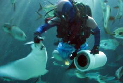 另方面,更有看頭的是「嫦娥下凡餵食秀」,澎湖水族館的潛水員,平日就與大洋池的生物有著良好的互動,與牠們更有如家人般的情感,在一舉手、一抬頭之間,都可以看見人、魚之間深厚的情感;因此,在餵食秀中,潛水人員會與大洋池內的生物玩耍、撫摸牠們的頭,而生物也把潛水員視為最好的夥伴,向潛水員撒嬌、玩遊戲,可說是人、魚一家親,和樂融融。