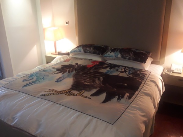 今天入住的精緻客房,一進房門著實有驚訝了一下,沒想到連被套跟枕頭套都是畫作去製作的。買不起名畫,至少還可以跟名畫一起睡一晚,哈哈~~![]()