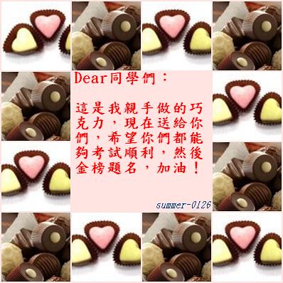 今天起了個大早,準備著要送給同學們的巧克力,也在今天早上九點,將巧克力全都送到同學們手上了,心中的石子也就此放下,因為我一直想要替同學們加油打氣!現在終於完成了,超開心!