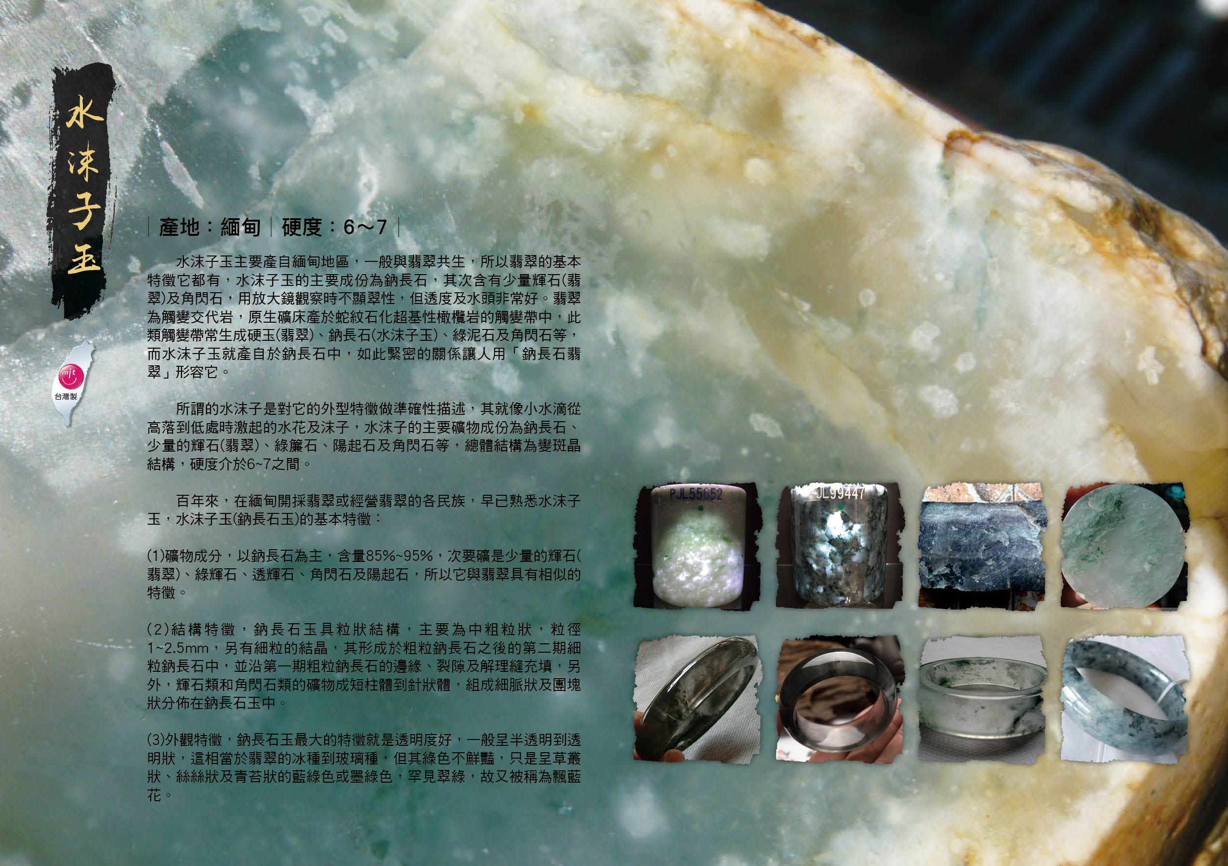 百年來,在緬甸開採翡翠或經營翡翠的各民族,早已熟悉水沫子玉,水沫子玉(鈉長石玉)的基本特徵:(1)礦物成分,以鈉長石為主,含量85%~95%,次要礦是少量的輝石(翡翠)、綠輝石、透輝石、角閃石及陽起石,所以它與翡翠具有相似的特徵。(2)結構特徵,鈉長石玉具粒狀結構,主要為中粗粒狀,粒徑1~2.5mm,另有細粒的結晶,其形成於粗粒鈉長石之後的第二期細粒鈉長石中,並沿第一期粗粒鈉長石的邊緣、裂隙及解理縫充填,另外,輝石類和角閃石類的礦物成短柱體到針狀體,組成細脈狀及團塊狀分佈在鈉長石玉中。(3)外觀特徵,鈉長石玉最大的特徵就是透明度好,一般呈半透明到透明狀,這相當於翡翠的冰種到玻璃種,但其綠色不鮮豔,只是呈草叢狀、絲絲狀及青苔狀的藍綠色或墨綠色,罕見翠綠,故又被稱為飄藍花。