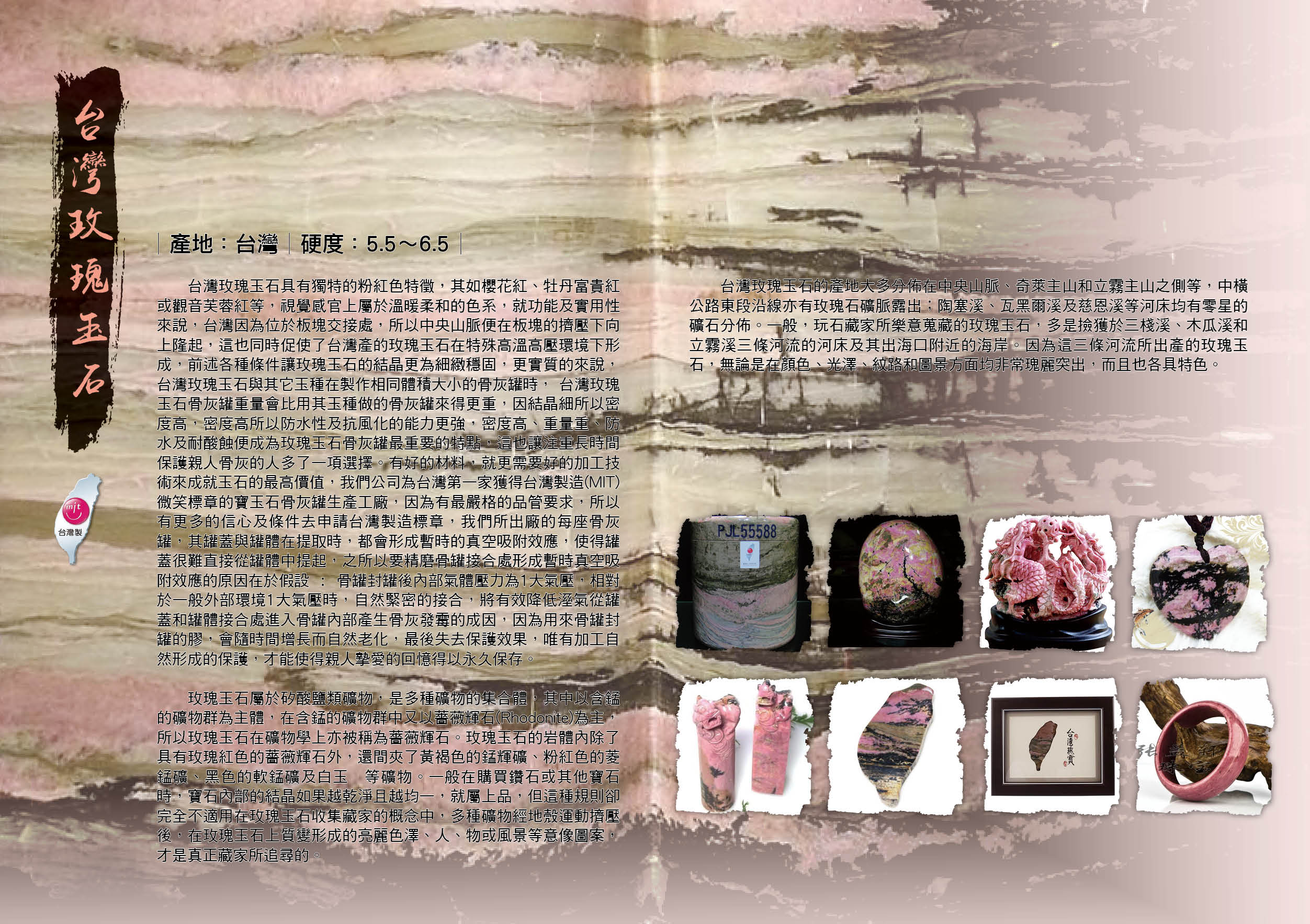 台灣玫瑰玉石具有獨特的粉紅色特徵,其如櫻花紅、牡丹富貴紅或觀音芙蓉紅等,視覺感官上屬於溫暖柔和的色系,就功能及實用性來說,台灣因為位於板塊交接處,所以中央山脈便在板塊的擠壓下向上隆起,這也同時促使了台灣產的玫瑰玉石在特殊高溫高壓環境下形成,前述各種條件讓玫瑰玉石的結晶更為細緻穩固,更實質的來說,台灣玫瑰玉石與其它玉種在製作相同體積大小的骨灰罐時, 台灣玫瑰玉石骨灰罐重量會比用其玉種做的骨灰罐來得更重,因結晶細所以密度高,密度高所以防水性及抗風化的能力更強,密度高、重量重、防水及耐酸蝕便成為玫瑰玉石骨灰罐最重要的特點,這也讓注重長時間保護親人骨灰的人多了一項選擇。有好的材料,就更需要好的加工技術來成就玉石的最高價值,我們公司為台灣第一家獲得台灣製造(MIT)微笑標章的寶玉石骨灰罐生產工廠,因為有最嚴格的品管要求,所以有更多的信心及條件去申請台灣製造標章,我們所出廠的每座骨灰罐,其罐蓋與罐體在提取時,都會形成暫時的真空吸附效應,使得罐蓋很難直接從罐體中提起,之所以要精磨骨罐接合處形成暫時真空吸附效應的原因在於假設 : 骨罐封罐後內部氣體壓力為1大氣壓,相對於一般外部環境1大氣壓時,自然緊密的接合,將有效降低溼氣從罐蓋和罐體接合處進入骨罐內部產生骨灰發霉的成因,因為用來骨罐封罐的膠,會隨時間增長而自然老化,最後失去保護效果,唯有加工自然形成的保護,才能使得親人摯愛的回憶得以永久保存。