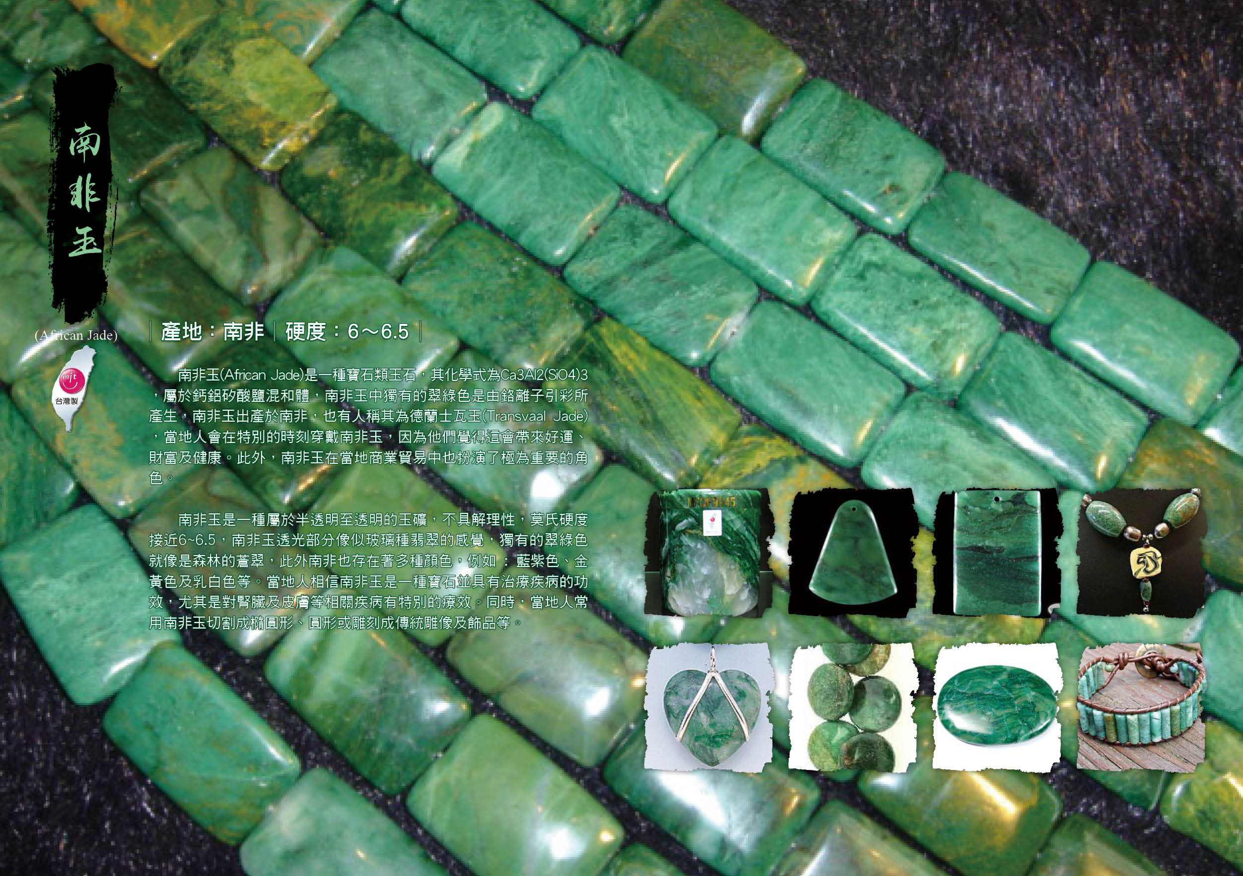 南非玉是一種屬於半透明至透明的玉礦,不具解理性,莫氏硬度接近6~6.5,南非玉透光部分像似玻璃種翡翠的感覺,獨有的翠綠色就像是森林的蒼翠,此外南非也存在著多種顏色,例如 : 藍紫色、金黃色及乳白色等。當地人相信南非玉是一種寶石並具有治療疾病的功效,尤其是對腎臟及皮膚等相關疾病有特別的療效。同時,當地人常用南非玉切割成橢圓形、圓形或雕刻成傳統雕像及飾品等。