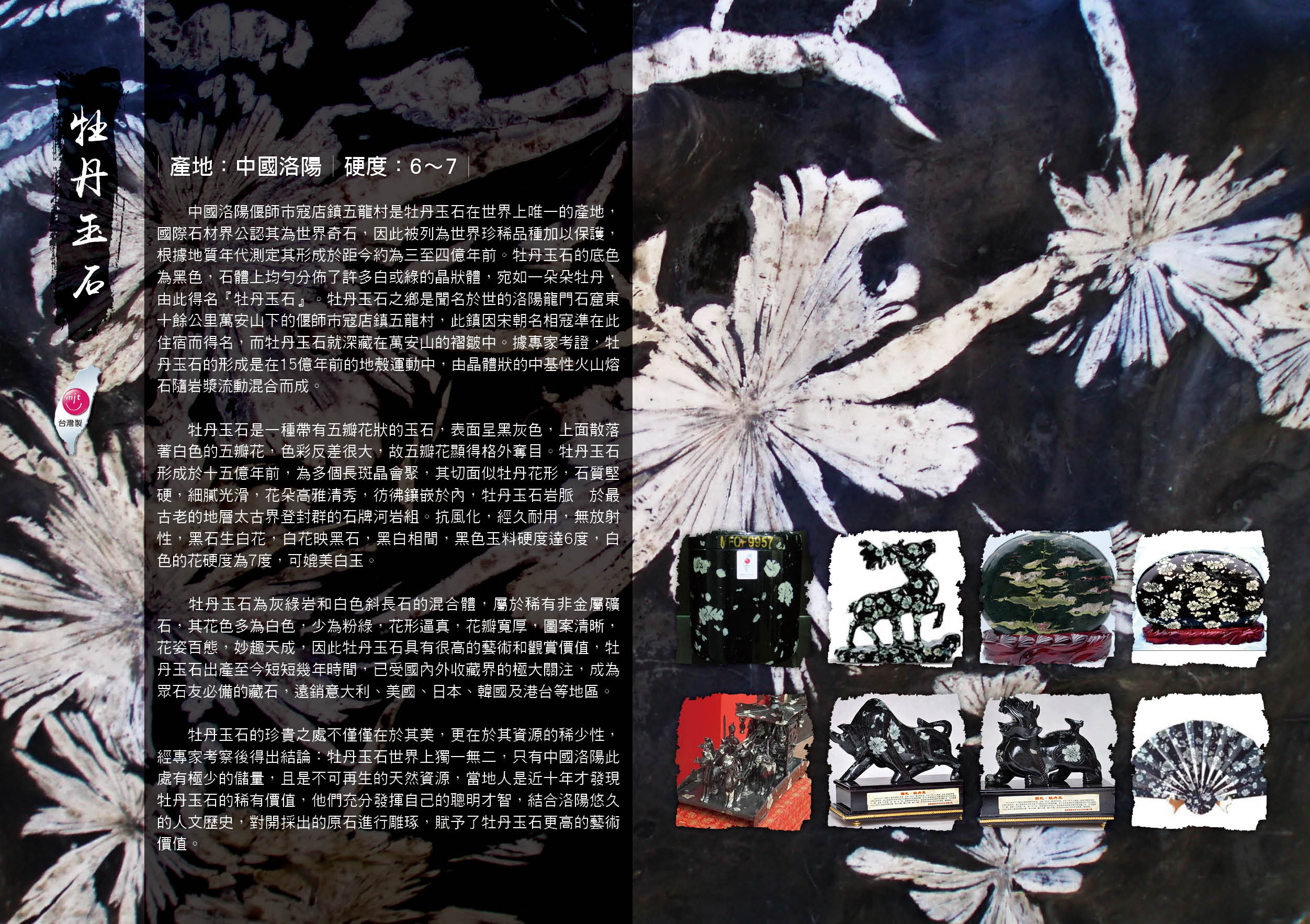 牡丹玉石是一種帶有五瓣花狀的玉石,表面呈黑灰色,上面散落著白色的五瓣花,色彩反差很大,故五瓣花顯得格外奪目。牡丹玉石形成於十五億年前,為多個長斑晶會聚,其切面似牡丹花形,石質堅硬,細膩光滑,花朵高雅清秀,彷彿鑲嵌於內,牡丹玉石岩脈産於最古老的地層太古界登封群的石牌河岩組。抗風化,經久耐用,無放射性,黑石生白花,白花映黑石,黑白相間,黑色玉料硬度達6度,白色的花硬度為7度,可媲美白玉。