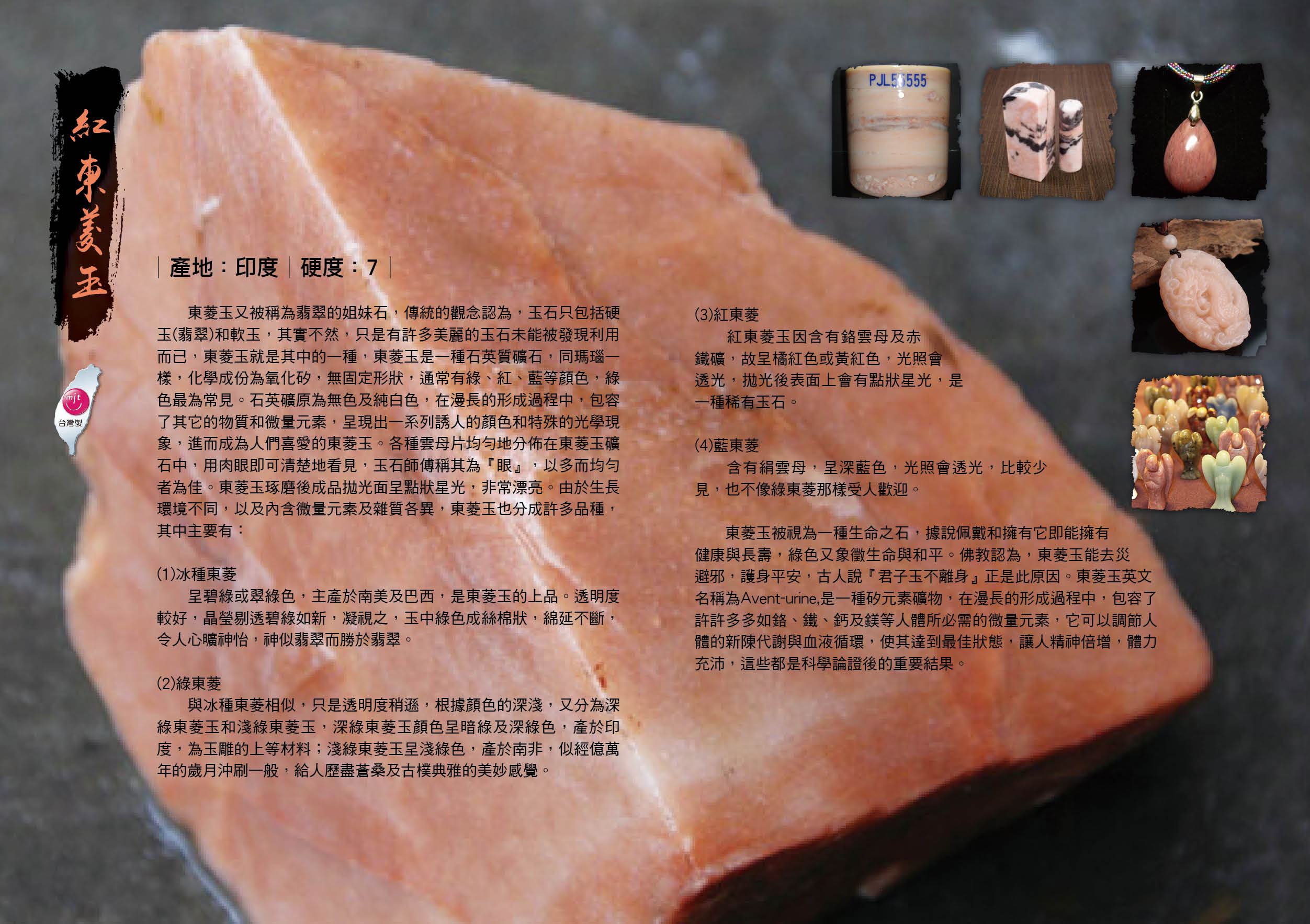 紅東菱玉因含有鉻雲母及赤鐵礦,故呈橘紅色或黃紅色,光照會透光,拋光後表面上會有點狀星光,是一種稀有玉石。