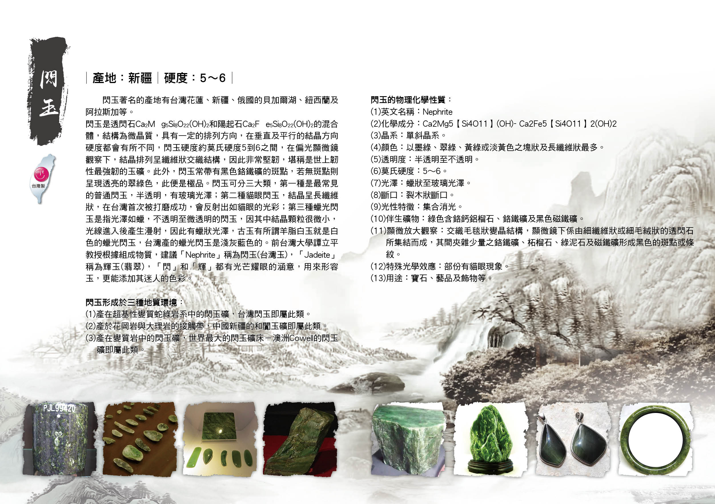 閃玉是透閃石Ca2M g5Si8O22(OH)2和陽起石Ca2F e5Si8O22(OH)2的混合體,結構為微晶質,具有一定的排列方向,在垂直及平行的結晶方向硬度都會有所不同,閃玉硬度約莫氏硬度5到6之間,在偏光顯微鏡觀察下,結晶排列呈纖維狀交織結構,因此非常堅韌,堪稱是世上韌性最強韌的玉礦。此外,閃玉常帶有黑色鉻鐵礦的斑點,若無斑點則呈現透亮的翠綠色,此便是極品。 閃玉可分三大類,第一種是最常見的普通閃玉,半透明,有玻璃光澤;第二種貓眼閃玉,結晶呈長纖維狀,在台灣首次被打磨成功,會反射出如貓眼的光彩;第三種蠟光閃玉是指光澤如蠟,不透明至微透明的閃玉,因其中結晶顆粒很微小,光線進入後產生漫射,因此有蠟狀光澤,古玉有所謂羊脂白玉就是白色的蠟光閃玉, 台灣產的蠟光閃玉是淺灰藍色的。 前台灣大學譚立平教授根據組成物質,建議「Nephrite」稱為閃玉(台灣玉),「Jadeite」稱為輝玉(翡翠),「閃」和「輝」都有光芒耀眼的涵意,用來形容玉,更能添加其迷人的色彩。