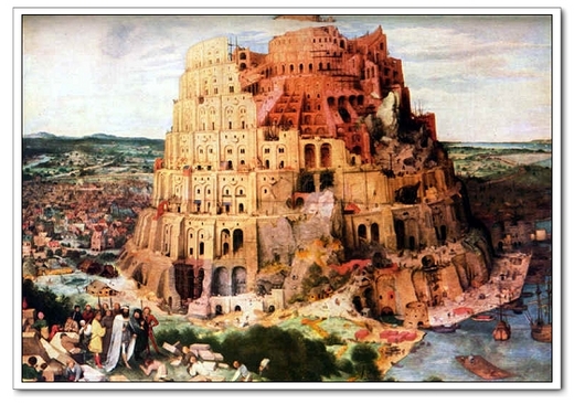 《舊約.創世紀》記載,人們為了怕再被大洪水淹沒,就在巴比倫蓋一座「巴別塔」,希望能通達天頂,結果引起上帝不悅,讓人們說各種不同的語言,因為無法溝通,不僅「巴別塔」蓋不成,也加速巴比倫的衰亡。
