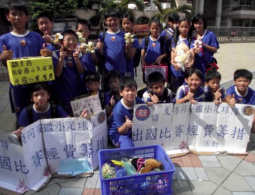 「請支持同安國小足球隊」、「支持我們出國比賽」足球隊學生到大賣場前叫賣,也一家一家店面推銷,把裝足求的籃子改裝拍賣品,還用紙箱做成海報,「不會怕啊」陳韋安、陳韋名兄弟說,大家在一起人多就不會害羞,一想到賣不出去就沒旅費,所以不會害怕開口。
