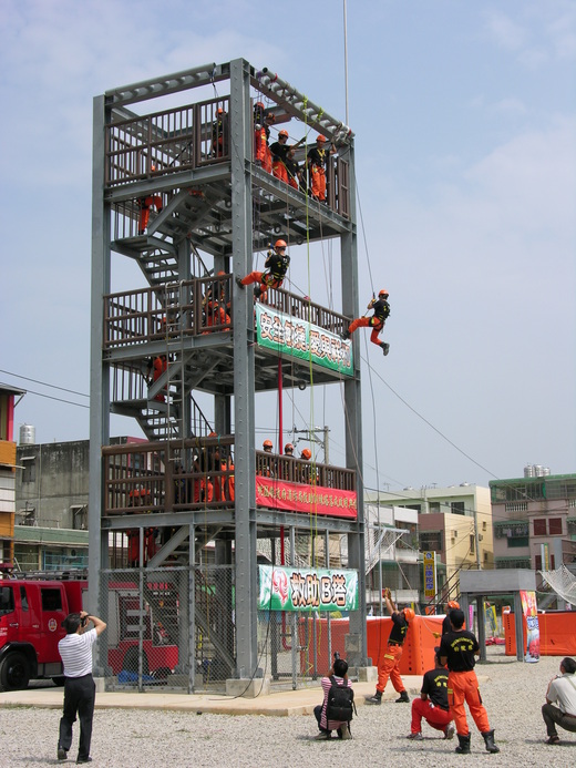 ●總工程款257萬6000元的桃園縣政府消防局救助訓練塔,今天在桃園縣中壢市榮民南路旁正式啟用,這座救助訓練塔超吊的,站在主塔頂端約5層樓高,可以訓練膽識,惜非消防隊員與義消無緣體驗。