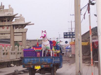 這張照片是我在山東曲阜散步閒晃時拍的,附近某個居喪的民家在使用紙俑,貨車正好經過陋巷牌坊.沒錯,正是那"一簞食,一瓢飲,居陋巷."的"陋巷".兩千多年前,這種在人類學歸類裡屬於"模擬巫術"的俑就已經存在.那麼,顏淵清晨起床,走出巷口要去找孔老師的時候,或許也曾剛好撞見這般景象.