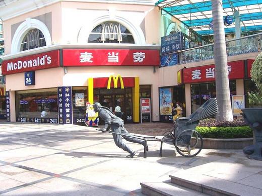 這張照片是在東莞東城步行街的入口拍的, 麥當勞的位置有吞吐來客之勢. 和台北一樣, 大陸的麥當勞也總是當仁不讓地穩坐在鬧區的路衝. 在這頭年營業額高達美金一百八十多億的世界速食怪獸前面, 被擺上一個銅鉛合金的人力車伕雕塑. 這個清國裝扮的車伕頂著大太陽, 以斜身幾乎 40度的俯角頭也不抬地使勁向前疾拉. 他的頭上頂了一條長長的辮子, 如果坐在那部人力車上往他看, 這顆頭顱就像是一隻小蝌蚪, 或乾脆像是一隻被擠出所謂炎黃龍根的小小精子, 奮力地逆游於每況愈下的世道. 這好比是一種生存的鬥爭, 終點若不是卑微地完成本能的繁衍, 便是滅亡.
