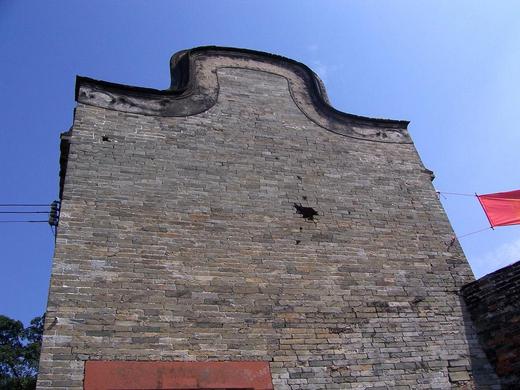 這張照片是在東莞石排鎮的塘尾村拍的. 只見山牆的頂邊中央有一個卯起來對稱凸起的線條, 看上去像是鍋蓋的頭, 又像鍋子本身兩旁的把手. 它有個名稱, 叫"鑊耳". 鑊是鼎鑊, 也就是鍋子的意思. 這種鑊耳式的山牆是廣東民居一個很重要的特色, 在廣州, 東莞, 甚至香港, 就是"廣府文化"為主流之地(廣東大致可分為廣府, 潮汕, 客家三個語言/文化系統), 鑊耳相當普遍, 也有許多是出現在廟宇或祠堂等公共建築的.