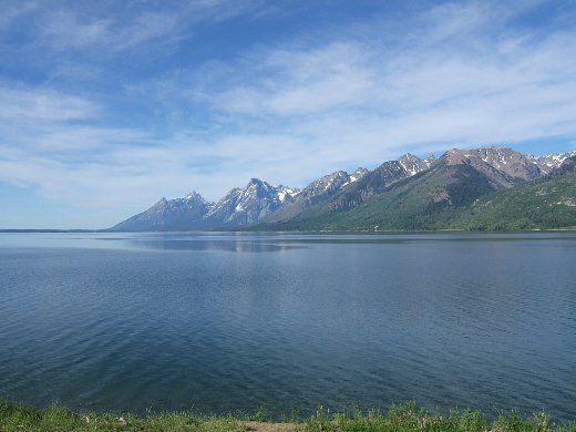 從機場出來後, 已經是用餐時間, 彎進機場附近的一家餐廳, 剛過八點, 天色尚齎, 旁邊隔了河, 就是那排大鐵頓山, 邊吃邊賞景緻. 想不到在二十個鐘頭前還在辦公室忙著趕東趕西的, 此時竟然已在這裡享受寧靜的美景, 整個心就沉浸在一片閒情逸致裡, 很是舒暢. 這就是我們期待很久的假期, 每隔一段時間, 我們總要回到山林裡, 去接受原野的洗禮, 重新梳洗羽翼, 然後回去再出發. 我們喜歡山, 也喜歡寧靜的湖, 若有清澈的小溪, 更會讓我們流連忘返. 這些美景, 在這兩個國家內放眼都是, 我們就這樣抱著滿懷的期望和興奮, 往第一站開了過去.