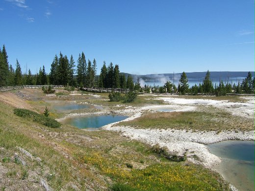 同樣在下噴泉區內, 繼續走, 會到火口湖(Firehole Lake), 那是一大片溫泉湖, 一條溪流從一邊彎延過去, 連著兩個淺水湖, 水看起來黑黑的, 是因為底部礦物質顏色的關系, 水其實很清澈, 但溫度很高, 熱氣直冒, 地面上燙滾滾的, 很不好受. 這一區如果是在日本的話, 早就開闢成泡湯池了, 裡面一定塞滿了人, 但這是在美國的國家公園內, 裡面一個人都沒有.