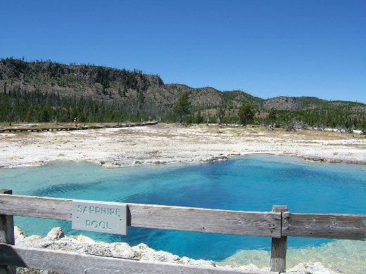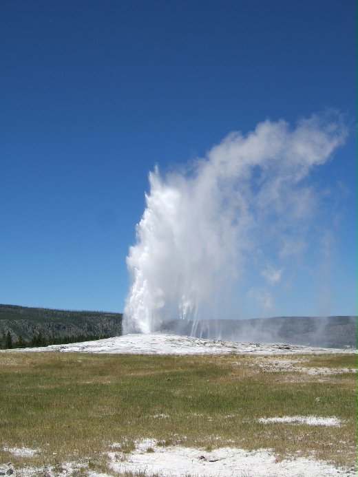 從老噴泉那區出來, 往北開幾公里的範圍內, 還有幾片的熱泉區, 我們一個一個的去鑽, 餅乾區(就叫Biscuit Basin, 我可沒亂取綽號)有個噴不停的溫水泉, 熱水池很多, 到了中途噴泉區(Midway Geyser Basin)又熱得半死, 那幾個大熱水池的水蒸氣很多, 硫磺氣又重, 聞了很不舒服, 或許是我們怕熱, 才不懂得享受那些溫泉的味道. 到下噴泉區(Lower Geyser Basin)時又不太一樣的感覺, 這一區會噴的噴泉很多, 但都要等很久才會看到, 公園管理處還派了專人在旁邊作記錄, 把預報時間貼出來. 裡面一個就叫大噴泉的熱水噴泉(Great Fountain Geyser), 每隔八到十二小時噴一次, 我們到時, 已經過了預報時間一小時, 還沒噴, 一堆人在那邊等, 有人已經等了一個多鐘頭, 等我們坐下來後, 有人已經決定要走了. 但在我們拿出相機後, 那噴泉突然開始冒出來, 先給個五六公尺的小噴一下, 然後停個幾秒, 接著就開始大噴, 噴到三十幾公尺高, 而遠處另一座像城堡的噴泉正巧也開始噴, 引起所有人的歡呼, 都在我們的正前方, 可謂來得早, 不如來得巧, 沒有浪費任何時間, 跟我老婆說我們玩的效率很高.