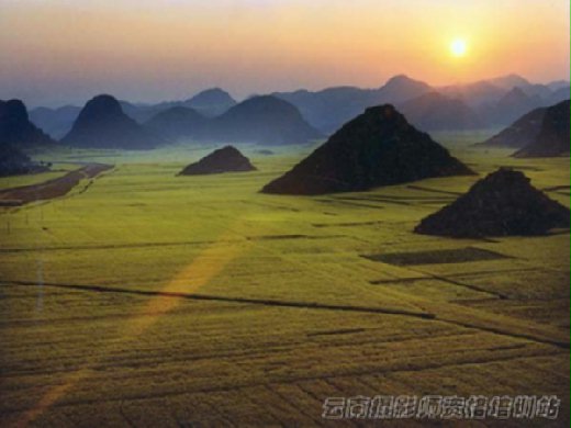 輾轉來到一處窮嶺曠野,野地中一片青田栽著一望無際的油桐花,極目眺去,一片豔黃花濤迎風搖曳,蔚為奇觀,充盈著眾人視野。油菜花海綿延數里,和遠處墨綠色山巒連成一線。