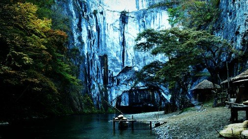 說話間舟將入洞,凌逍遙微微躬身,以防撞到洞頂石壁,乘機藉著洞口些許日光將洞內情境來回瀏覽一遍,不由得倒抽口涼氣,原來洞頂倒掛著無數石柱,或大或小,或粗或細,有的甚至快要觸及水面。洞內漆黑一團,若是一時不察,撞到石柱,頭破血流還算小事,若是扁舟顛覆,給激流衝個屍骨無存可就糟了。