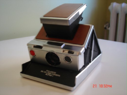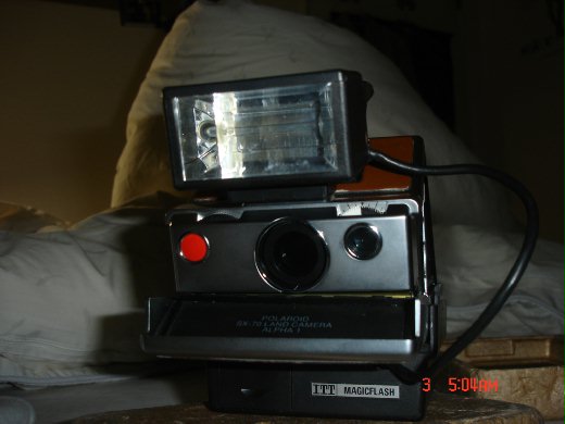 在看了BLAKE 的 Polaroid 的夢幻機種SLR 690之後~~也忍不住地買了入門的機種 SX-70 ALPHA 1 。相機在十月初就從E-bay上寄到了我手中,一開始當然市滿懷心喜地準備俇拍,但是在照了幾張之後卻發現到相機瀑光的問題粉嚴重,當然就在網上開始找出解答囉~~後來經過網路上的先進指點過後才知道,sx-70 加上600 型的底片會有過度瀑光的問題,須要減光鏡的配合來減低光線才能拍出好照片。當然不死心的我就一直想說~~我的sx-70也許就是那一台不需要減光鏡的相機歐。想當然~~我錯了。在拍壞近二十張底片之後~~我放棄了~~心中一度想把這台剛入手的老相機給網拍回去~~去換那一台夢幻的SLR 690 但是在看到近五百美金的高價後~~我退縮了→真的有夠貴的啦。所以啦~~這台相機就在十一月份過後一直沉寂在我的行李箱內~~一直等待復出的日子→→就是我回台灣的日子。終於在經過近一個半月的寂靜無聲之後,我的sx-70 終於在2008年的一月一號復出了。""母ㄚ""~~減光鏡我買到了。順帶一提的是~~我也把閃光燈給買了,不囉嗦~~回家第一件事就是在晚上的室內試試看我閃光燈的效果~~順便也簡驗一下拍出來的成果。第一張是我剛入手sx-70在十月份的模樣。接下來就是它變身後的模樣了~~就像是全國電子一樣""駕感心""ㄚ。整個閃燈裝上去之後~~忽然間有一種感覺,好像是一個頭帶探照燈的礦工頭歐。