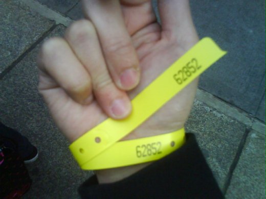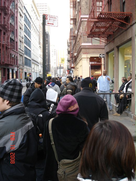 今天本來打算"呆" 在家裡啥事都不做的~~剛好李麥克打電話來說 channey 小妹 的爸媽剛好來紐約想約大家一起吃飯~~所以就想說那就去soho 的 玩具店看看吧~~反正吃飯的餐廳剛好在隔壁不遠的china town。 結果到了那邊卻發現外面排了一長隊的人龍~~不知道是要幹ㄇ的。進去後本來想在買一隻munny 的 看能不能讓我抽到棒球棍(我還是不死心),順便也問一下我的kid ninja 有沒有 庫存啦。網路上看了兩個星期~~結果給我顯示出sold out 是怎樣ㄚ~我就是要去店舖問問看~看有沒有存貨,說不定就被我給問到了~~哈哈~~一切都想像中的那樣美好ㄚ。結果一問才知道,今天是紐約發售kidninja 的日子,(上天冥冥中有注定ㄚ),外面的人龍是排隊準備購買的人潮~~店員問我要哪種顏色的,有白跟灰兩種可以選擇,每人限購一隻ㄚ。兩個我都粉喜歡~~但是我只有一個人來排隊,看其他人都是兩個人一起來,有的朋友四五個,有的是情侶檔一起來買,形影孤單的我只好選了白色的 (灰色的kidninja 我也想要 ㄚ) ~~結果店員發給我一個黃色的手環,上面有編號,順便也跟我說六點開始販售,可以到外面去排隊了。看看時間是下午四點整~~也就是說我要在外面的寒風當中一個人站兩個小時→當然外面的人潮也是不少啦~~結果我從天亮站到天黑ㄚ~跟我一起排隊的人也真的是不少 歐。有照片為證。第一張是kidrobot 發的手環→我買的是白色的~~所以拿到黃色手環。第二張照片是跟我一起排隊人的人潮歐~~有好多人都在問我們是在排什麼→結果當我們回答玩具的時候,每個人的表情都好像是看到"孝ㄟ"一樣。第三張是我的戰利品~~跟我的munny 排在一起的樣子。